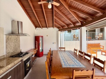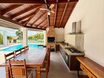 Chácara possui 6 banheiros, casa avarandada, Area gourmet com churrasqueira, fogão, coifa e forno (novo vai ser instalado), banheiro, possui mesa de madeira maciça para 10 pessoas, uma geladeira (Cervejeira).