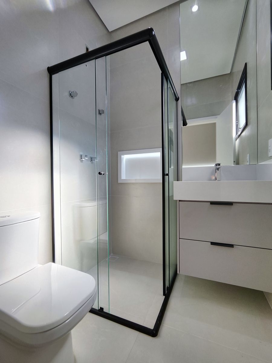 - Banheiros com armário, espelho, box e chuveiro eletrônico