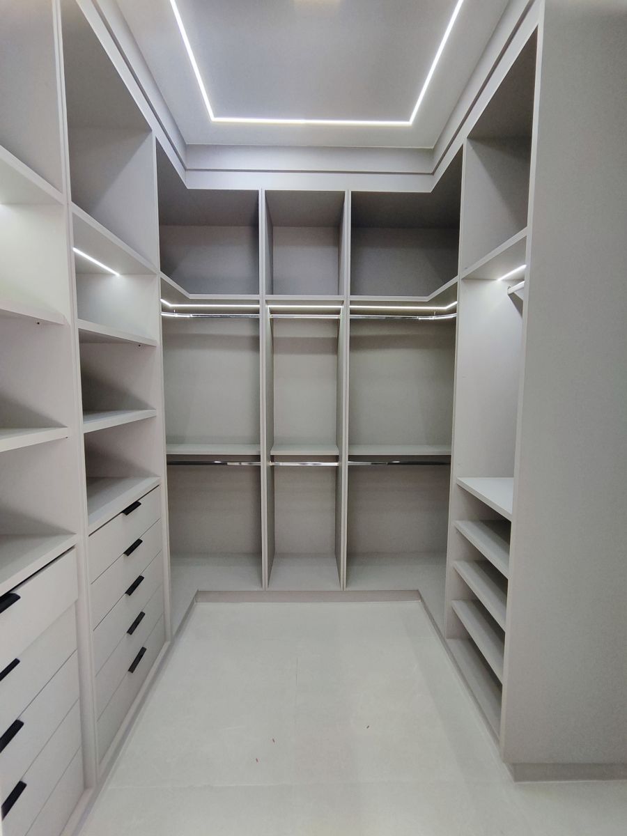 - Suíte master com armários, cabeceira de cama e criados mudos
