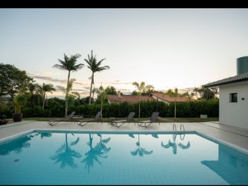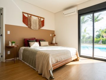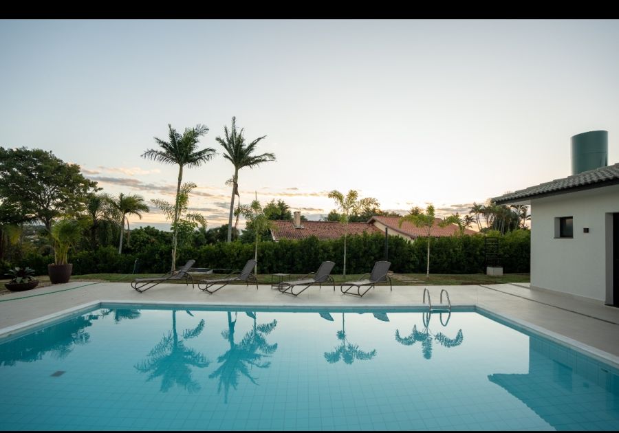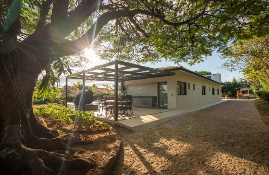 A casa conta com 4 amplas suítes, cada uma com seu próprio estilo e charme. Uma delas possui uma banheira de imersão para momentos de relaxamento total, enquanto outra tem um jardim interno privativo, trazendo a natureza para dentro de casa.