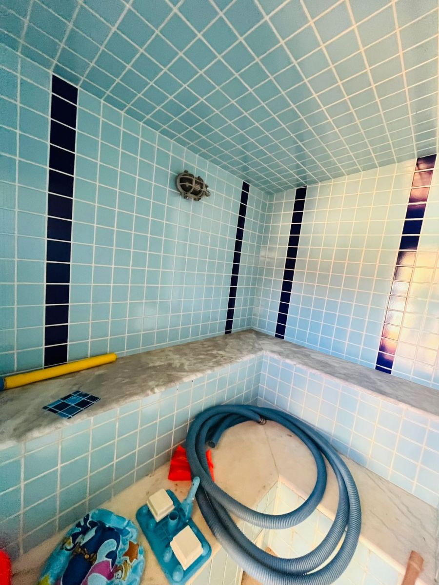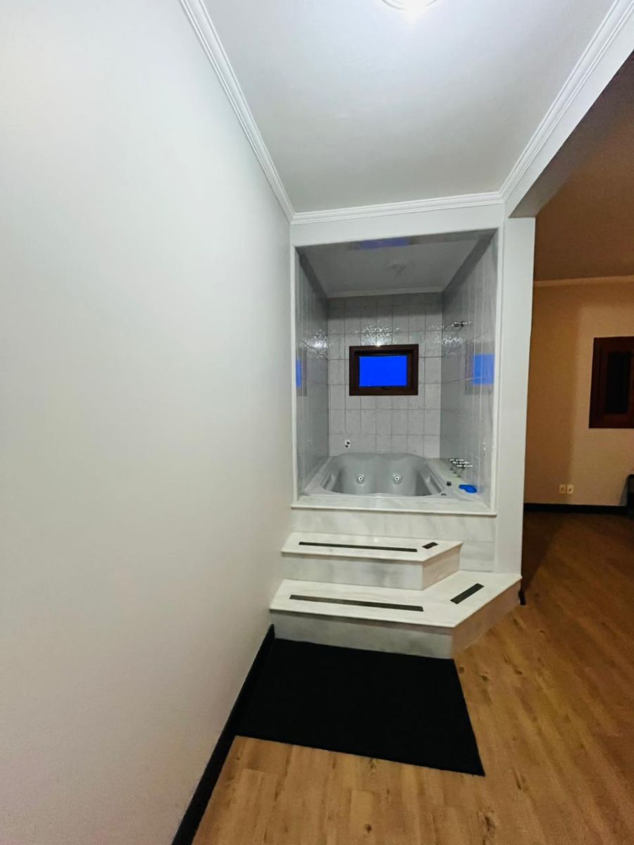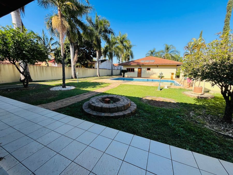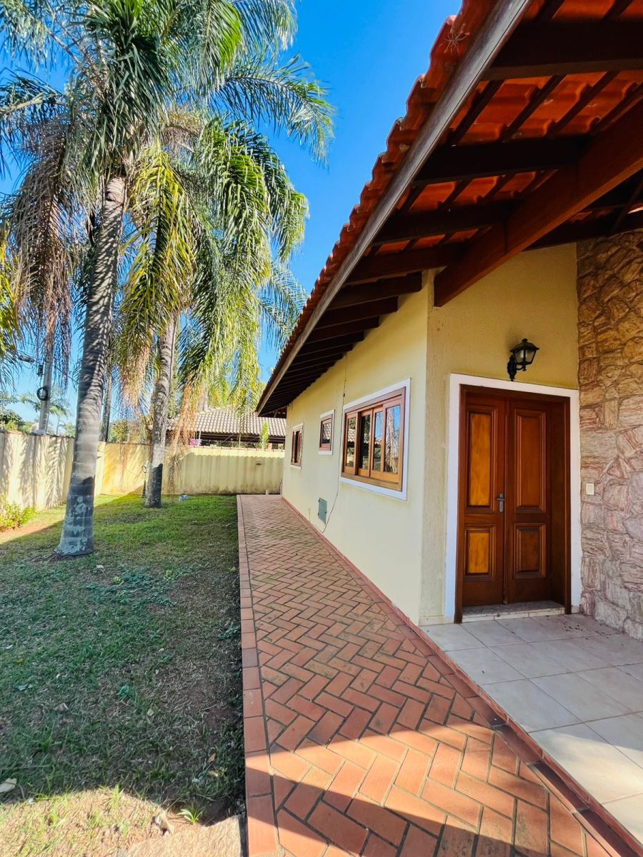 Piscina com prainha, hidro e cascata, sauna úmida, lareira rústica, churrasqueira completa, suíte externa e jardim com palmeiras imperiais.