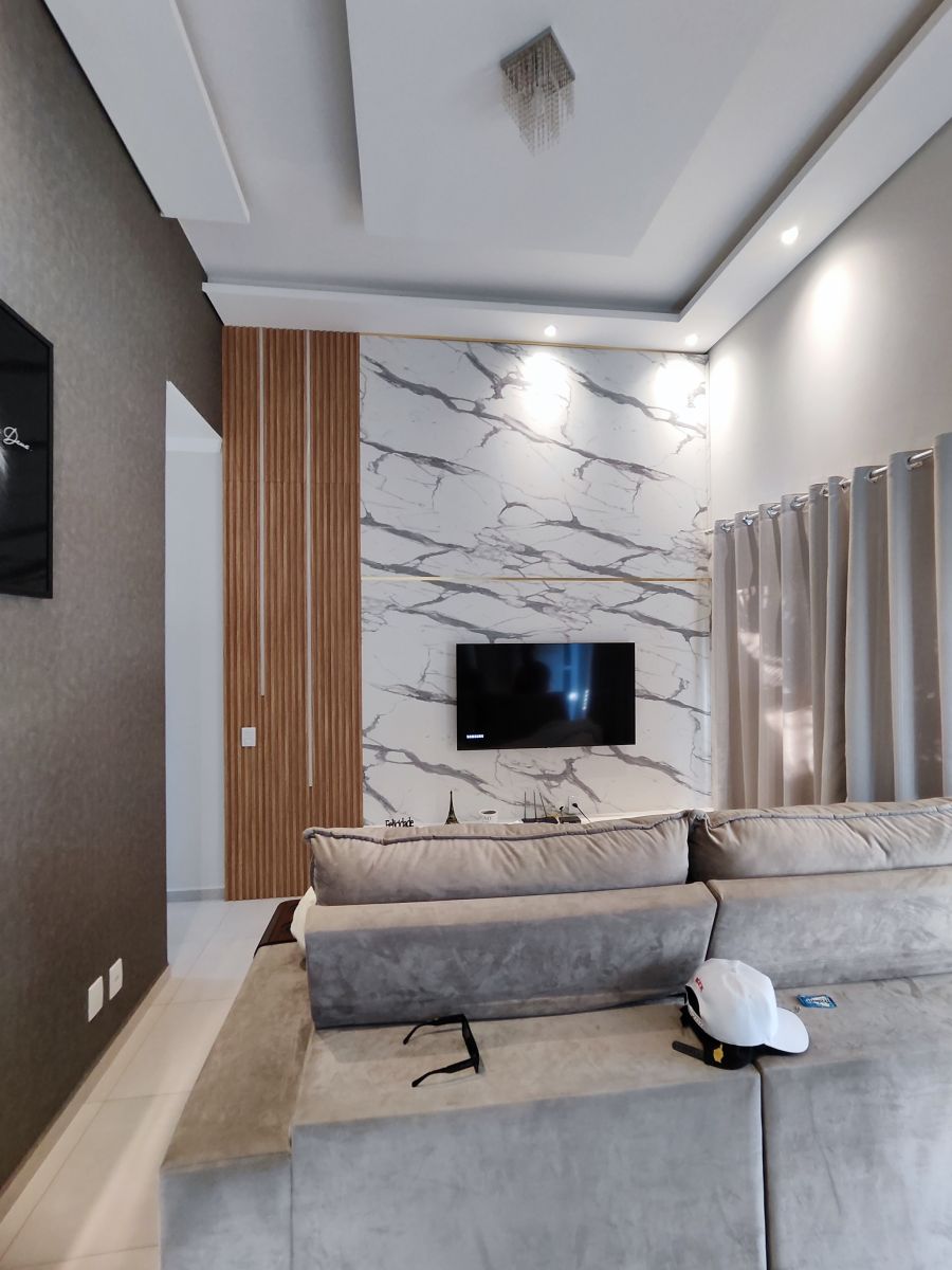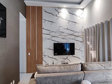 Sala aconchegante com painel