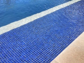 Piscina grande com hidromassagem e um deck para mesas e cadeiras